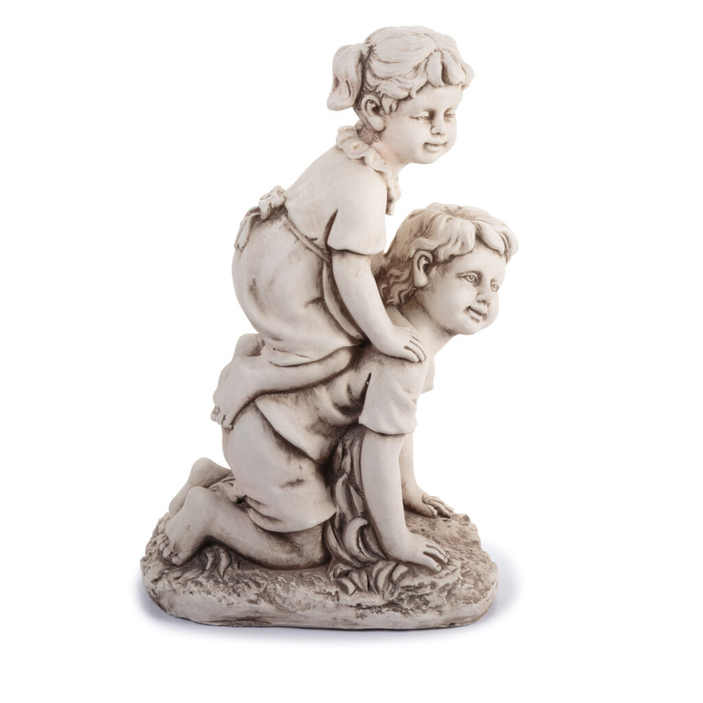 Esta figura de poliresina captura el juego infantil con un acabado piedra envejecida que aporta calidez provenzal.