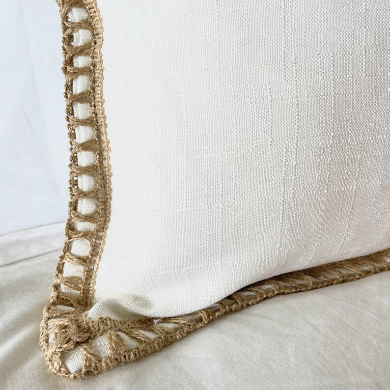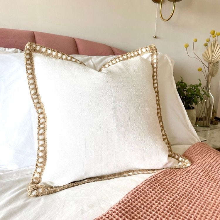 Delicada funda de cojín construida con excelentes materiales para relucir tu sofá, sitial o quizás tu dormitorio. Su diseño anudado en sus vértices le aporta una originalidad única.